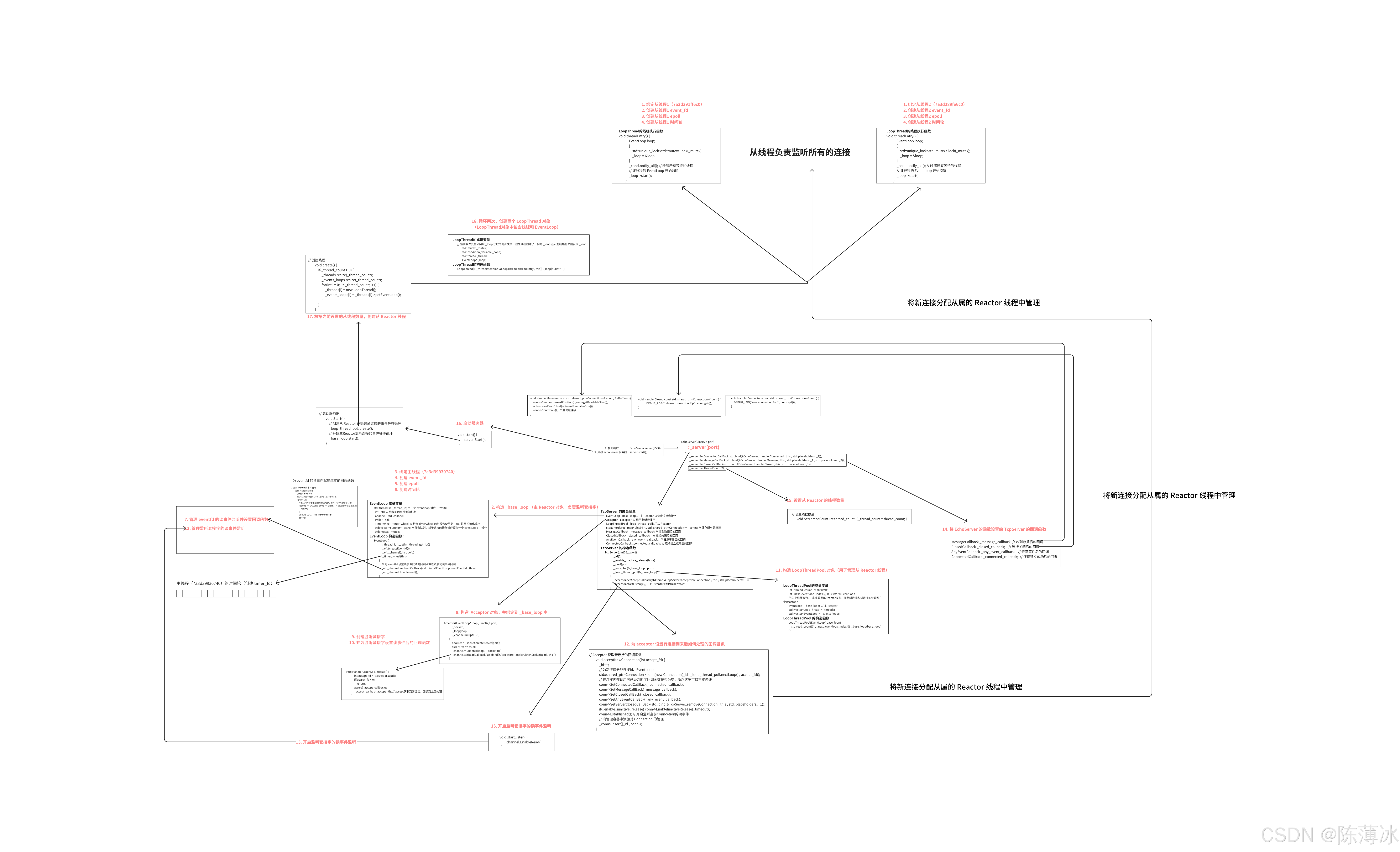 回调函数设置,由用户设置的,因为我们组件的设计者并不清楚用户要如何处理事件,因此提供一些回调函数由组件的使用者设置。而当 Acceptor 获取到新连接的文件描述符后,会调用 TcpServer 所设置的回调函数处理新连接,该回调函数主要负责创建并初始化一个 Connection 对象,并由 TcpServer 模块设置回调。