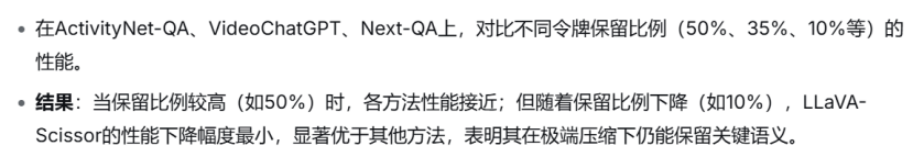 保留比例:整个视频经过压缩后,最终保留下来的令牌总数,占原始输入令牌总数的百分比。 - 语义损失分析:当保留比例低于35%(如10%、3%),所有方法性能急剧下降,但LLaVA-Scissor的下降幅度最小。例如在3%保留时,LLaVA-Scissor仍保持86.8%的原始性能,比FastV高出6.1%,证明其能更好地保留关键语义。