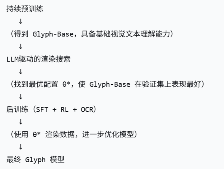 Glyph包括3个主要阶段:对渲染的长文本数据进行持续的预训练;LLM驱动的遗传搜索最优渲染配置;以及使用SFT、RL进行后训练。这些阶段共同实现了高效的长上下文建模和视觉-文本压缩。