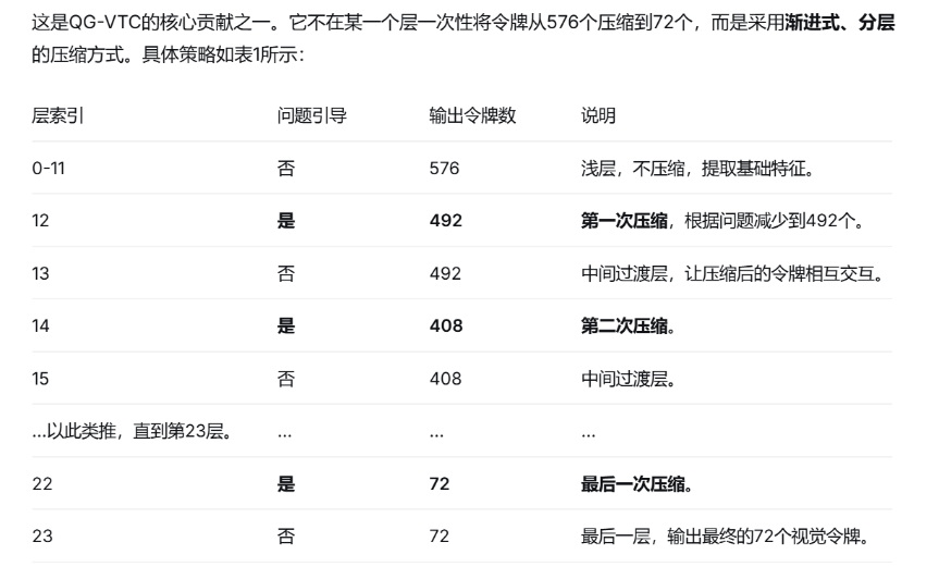Qg-VTC:针对 VQA,问题引导压缩,用文本编码器嵌入问题,筛选与问题相关的视觉 token,降低无关信息开销。