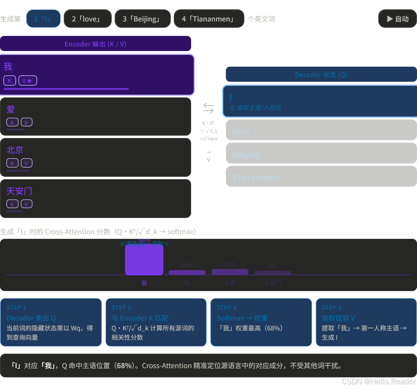 在翻译任务里,Decoder 生成英文时需要不断"回头看"中文原文。Cross-Attention 的工作原理: