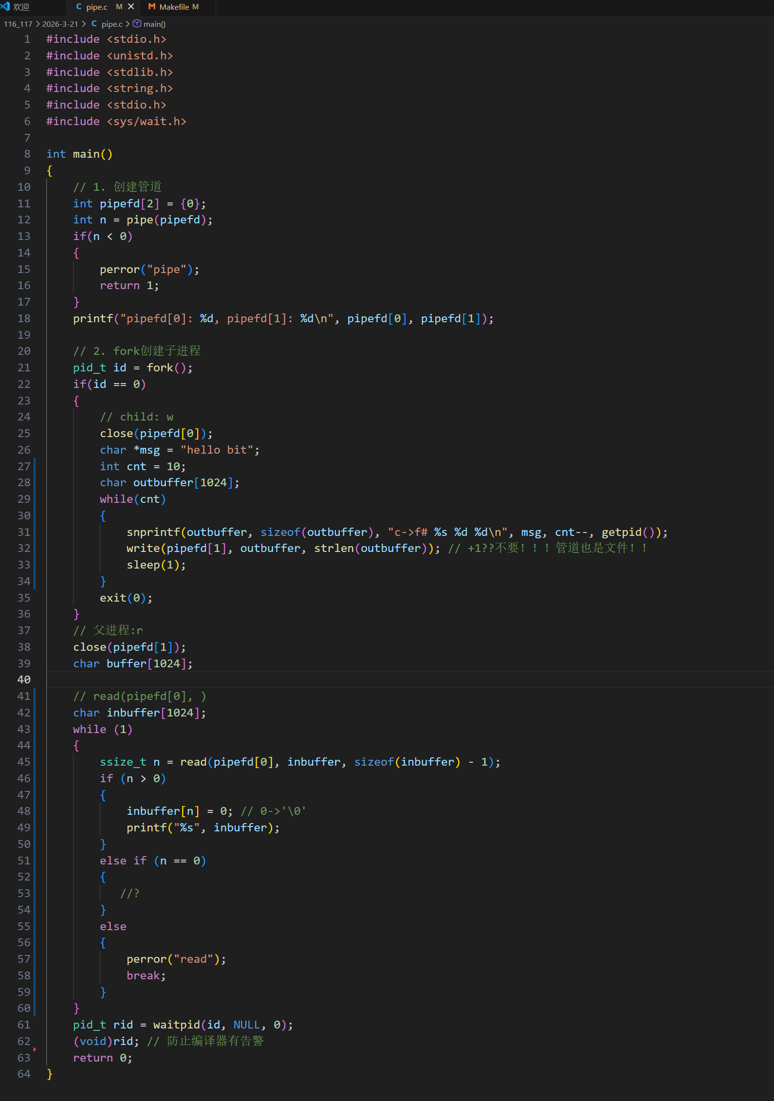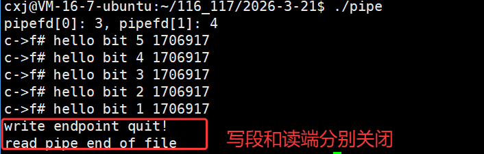 管道里的数据是连续的字节序列,没有"消息边界"。比如子进程分10次写管道,父进程可能一次读完所有字节,也可能分多次读,内核不保证"一次写对应一次读"。之前上面的代码里,子进程循环写 hello bit,父进程读到的是一整串字节流,而不是10条独立消息。并且数据严格按照写入顺序被读取,先写的字节先被读到,不会乱序。