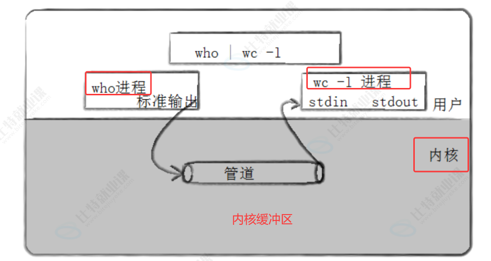 - who 进程将标准输出重定向 到管道的写入端 ,把登录用户信息写入内核缓冲区。