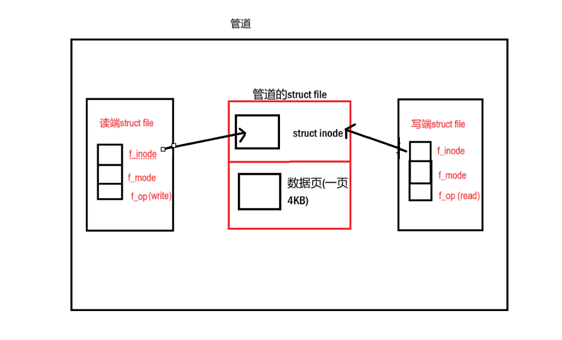 - 右侧方框表示读端 struct file,这是进程持有管道读端的操作句柄。struct file 里的 f_inode 指向内核中管道的索引节点(inode)。f_mode 标记为只读 (O_RDONLY)。f_op指向管道读操作函数集(只实现 read )。