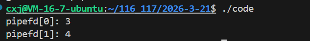 关闭冗余文件描述符,建立单向通信 : 为实现父进程向子进程单向通信,需要关闭冗余的文件描述符,父进程调用 close(fd[0]),关闭管道读端,仅保留写端 fd[1] = 4,只能向管道写入数据。子进程调用 close(fd[1]),关闭管道写端,仅保留读端 fd[0] = 3,只能从管道读取数据。最终形成父进程只写、子进程只读的单向数据流通道:父进程通过 write(4, ...) 向管道写入数据,子进程通过 read(3, ...) 从管道读取数据,同时保证了通信语义的清晰与安全。