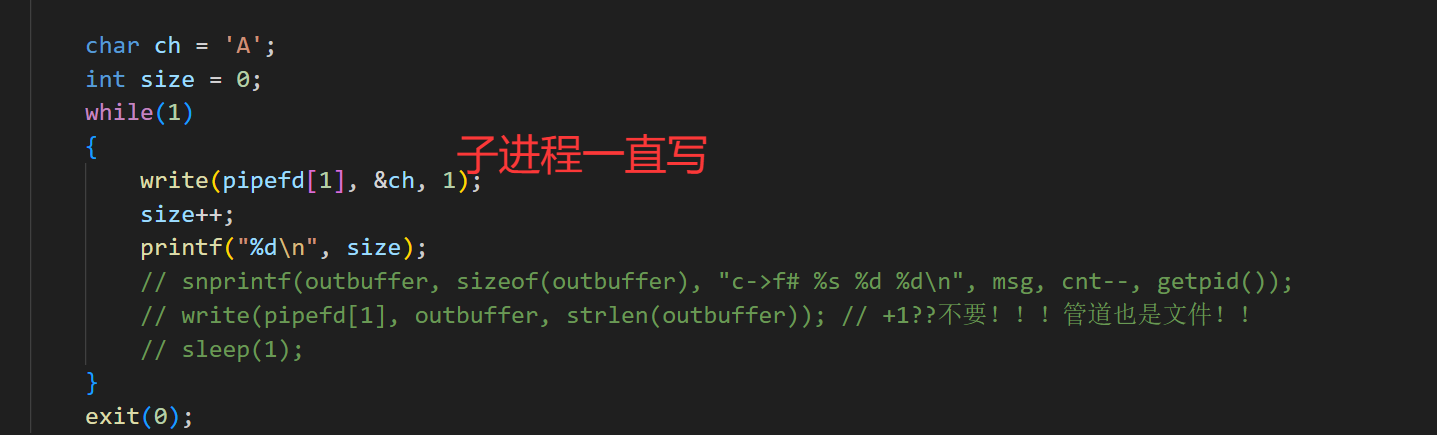 - 子进程写得快,父进程读得慢,就会造成子进程阻塞,因为管道缓冲区被写满了,没有空间可写,子进程调用 write() 时会被内核阻塞挂起,直到父进程读出数据腾出空间,才会被唤醒继续写