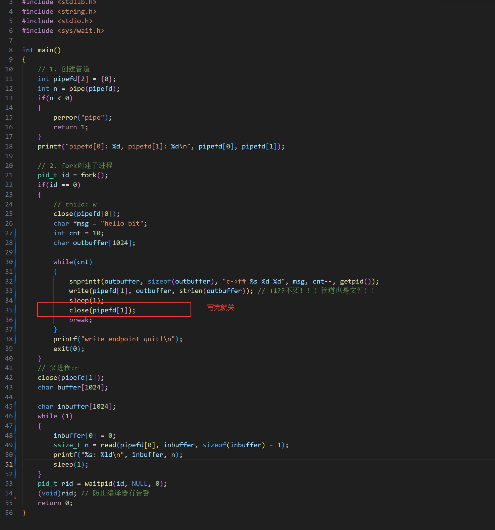 - 返回值 = 0:表示所有写端已关闭,管道中无剩余数据,可退出循环结束通信;