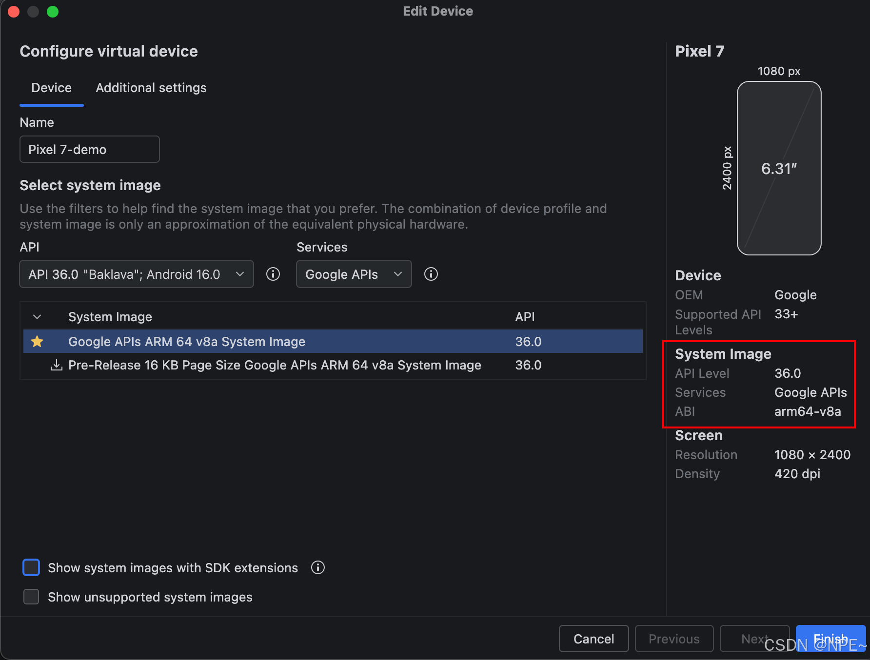 - 根据需要配置 AVD 名称,Services选择Google APIs,然后点击 Finish。