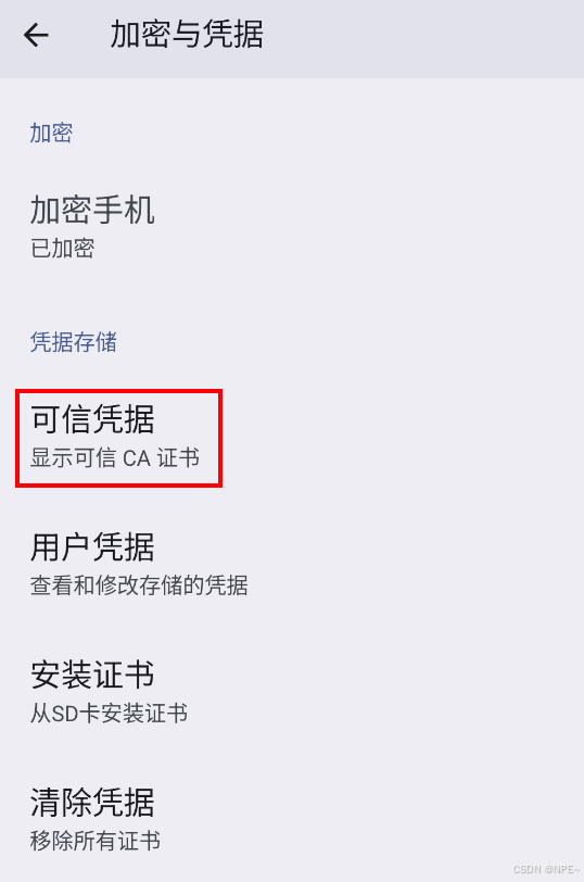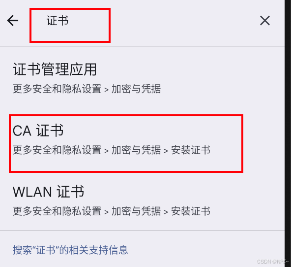 安装证书:设置-搜索框输入:证书 - CA证书