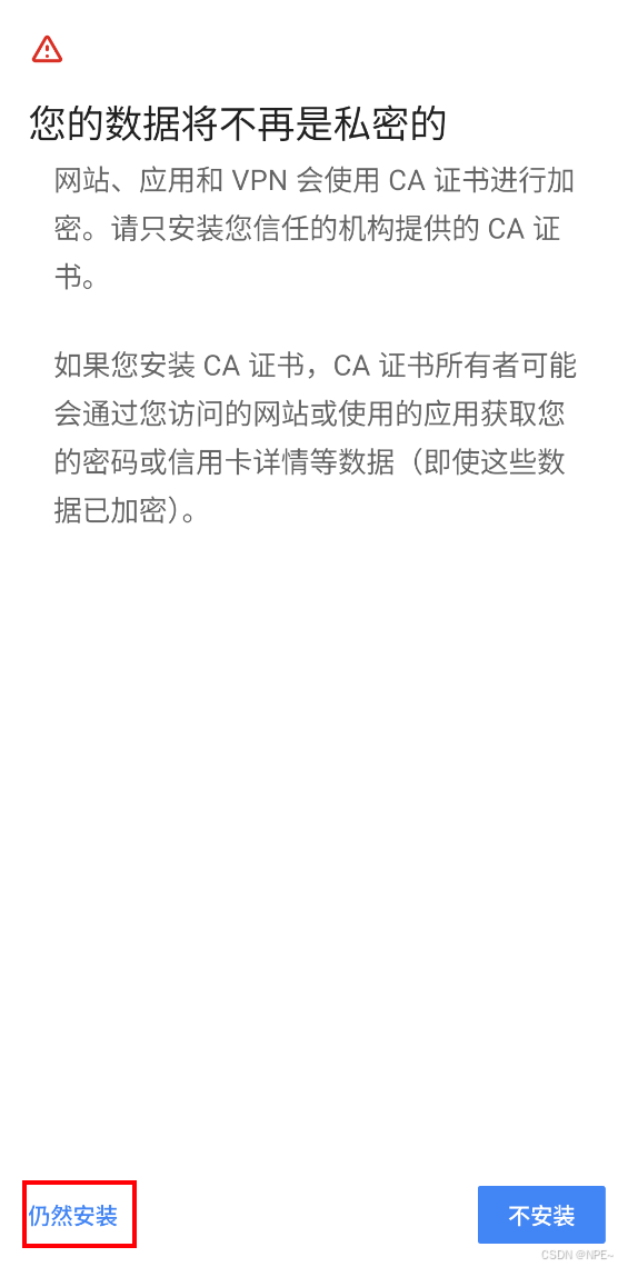 点击CA证书,选择仍然安装,然后找到自己上传到手机上的证书,点击证书进行安装