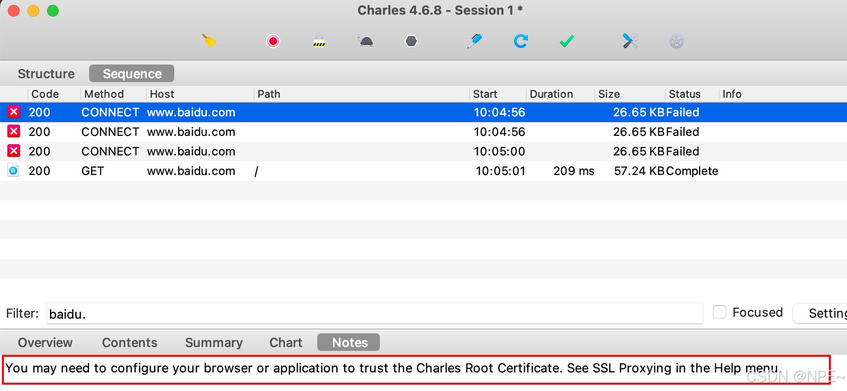 不过此时我们只能抓取http的包,还无法抓取https的包,因为没有配置Charles 根证书。再后面开启Root权限后,会告诉大家如何配置https证书并将用户证书移动到系统证书下,让我们可以抓取https包。