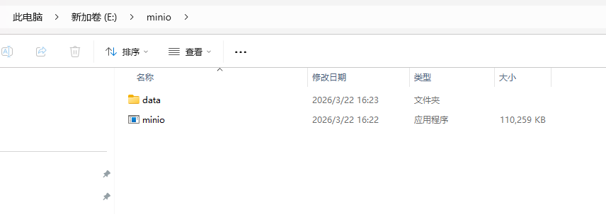 在下载保存的minio.exe目录创建一个data目录,用于保存数据