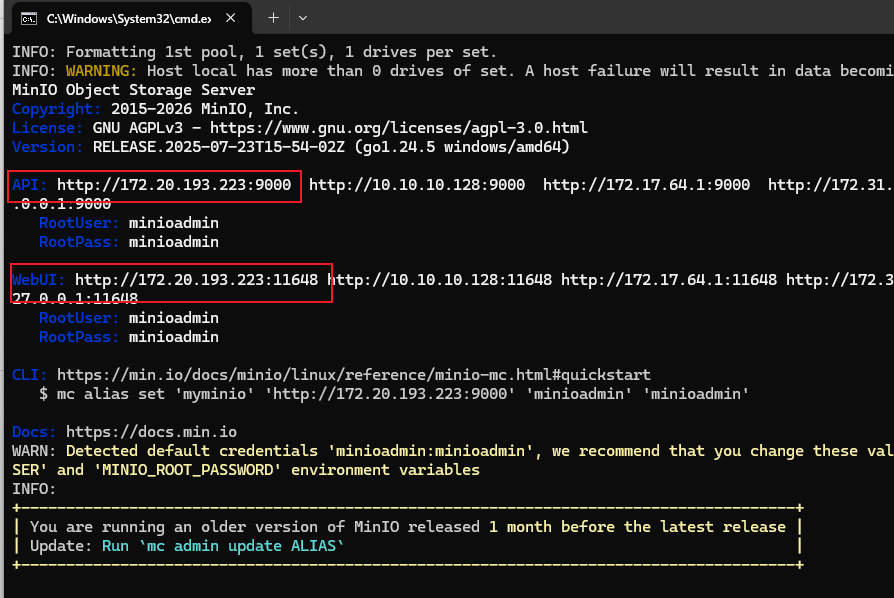 其中关注标红框内,表示默认用户名和密码都是minioadmin