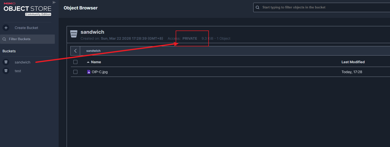 E:\minio>mc anonymous set public myminio/sandwich