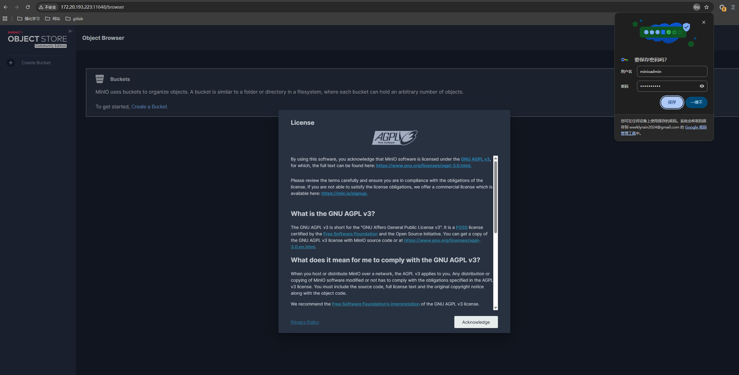 使用用户名和密码就是前面提到的默认是minioadmin