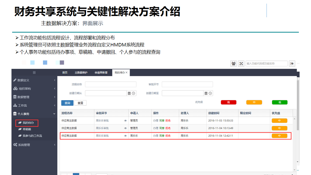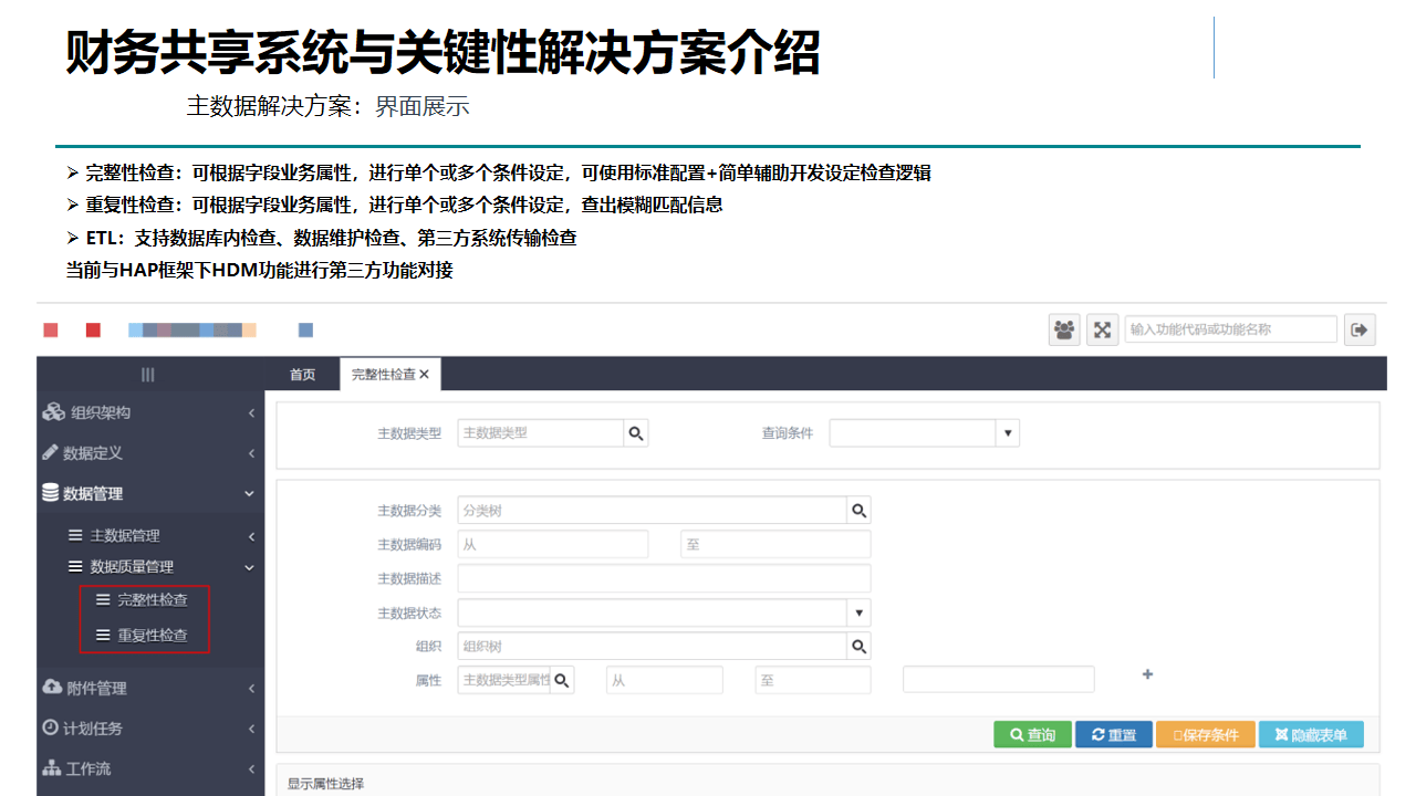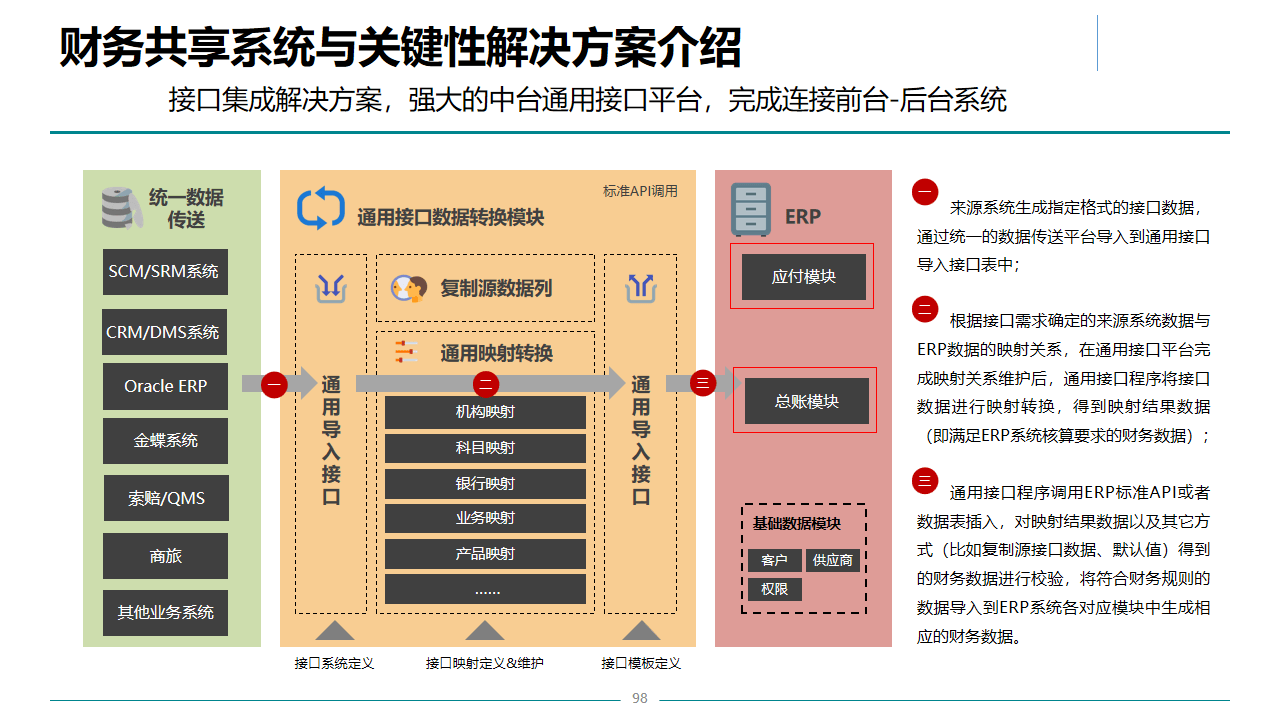 - 主数据管理(MDM): 建立集团统一的客商、物料、科目、组织、项目等主数据标准。实现"一处维护、全局共享",消除数据歧义,确保数据同源。