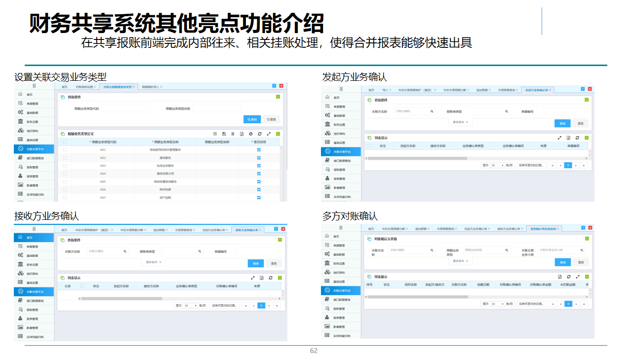 - 总账共享: 凭证自动生成、自动过账、期末自动结账、报表自动生成。