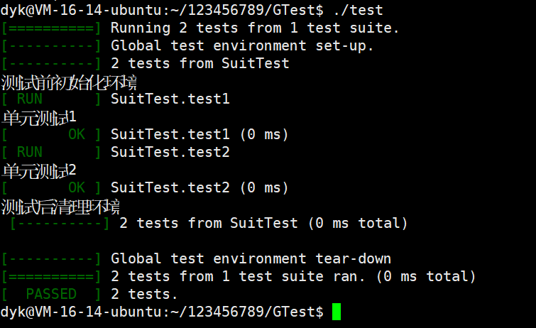 TEST_F(Suit_Global_Test, test1) // 最最重要的一点,单元测试的这个宏变成了 TEST_F,而且测试的名称必须与套件环境类名一致,保证单元测试宏函数可以直接访问类成员变量