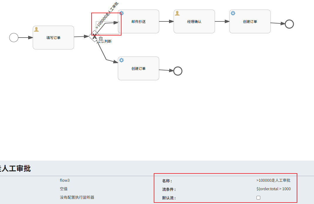 3、如果订单金额超过10万,则自动发送邮件抄送,然后需人工介入处理,经理进行确认;