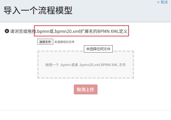 flowable-ui网页端可以对模型执行导入操作,导入的模型名称必须是**.bpmn.xml或.bpmn20.xml**,注意以点号开头,如果文件命名为其他,导入的时候会提示文件名错误,无法解析。