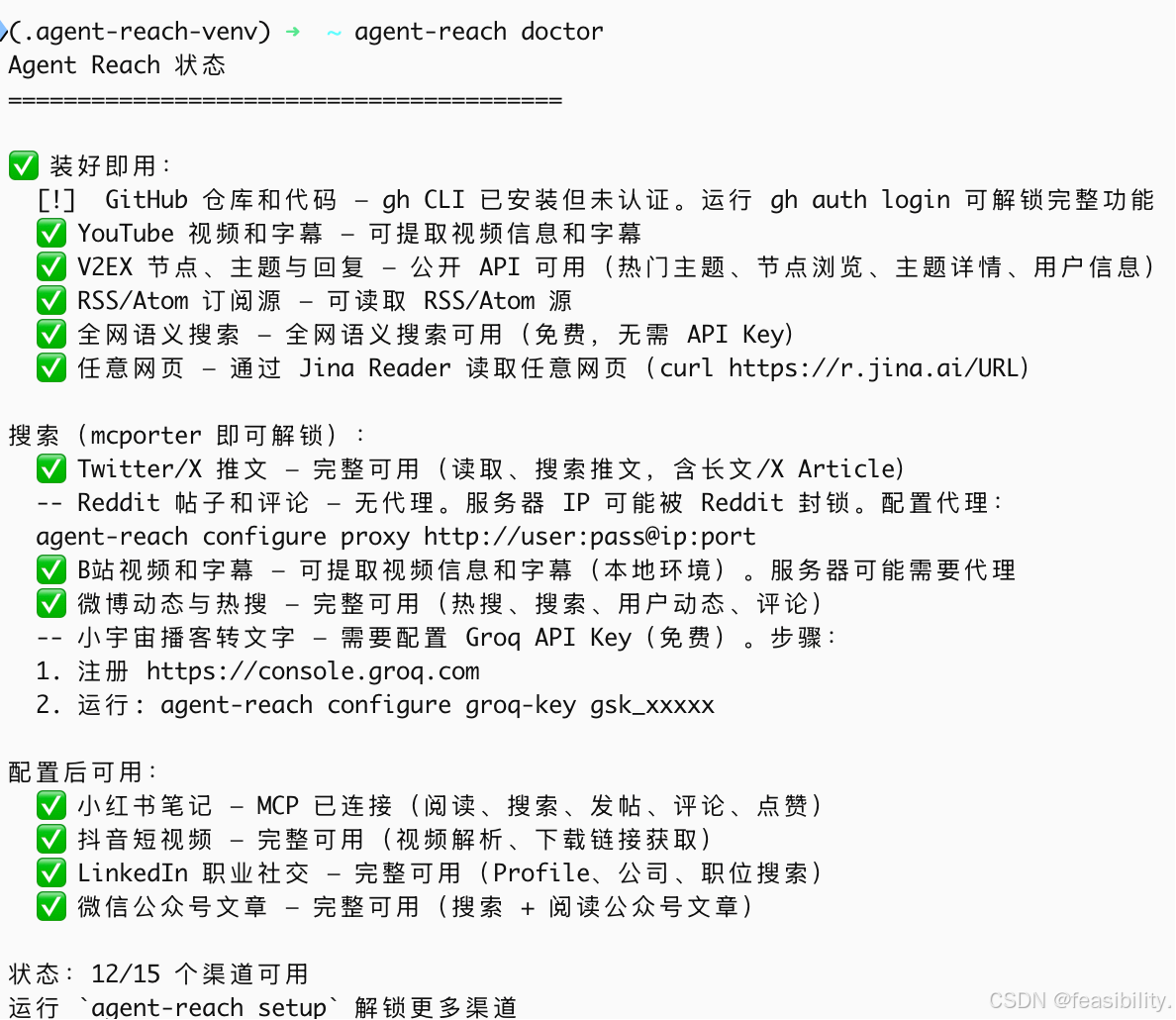 执行agent-reach doctor查看工具状态,只剩三个需配置和认证,注意V2EX很可能得开DL才能用