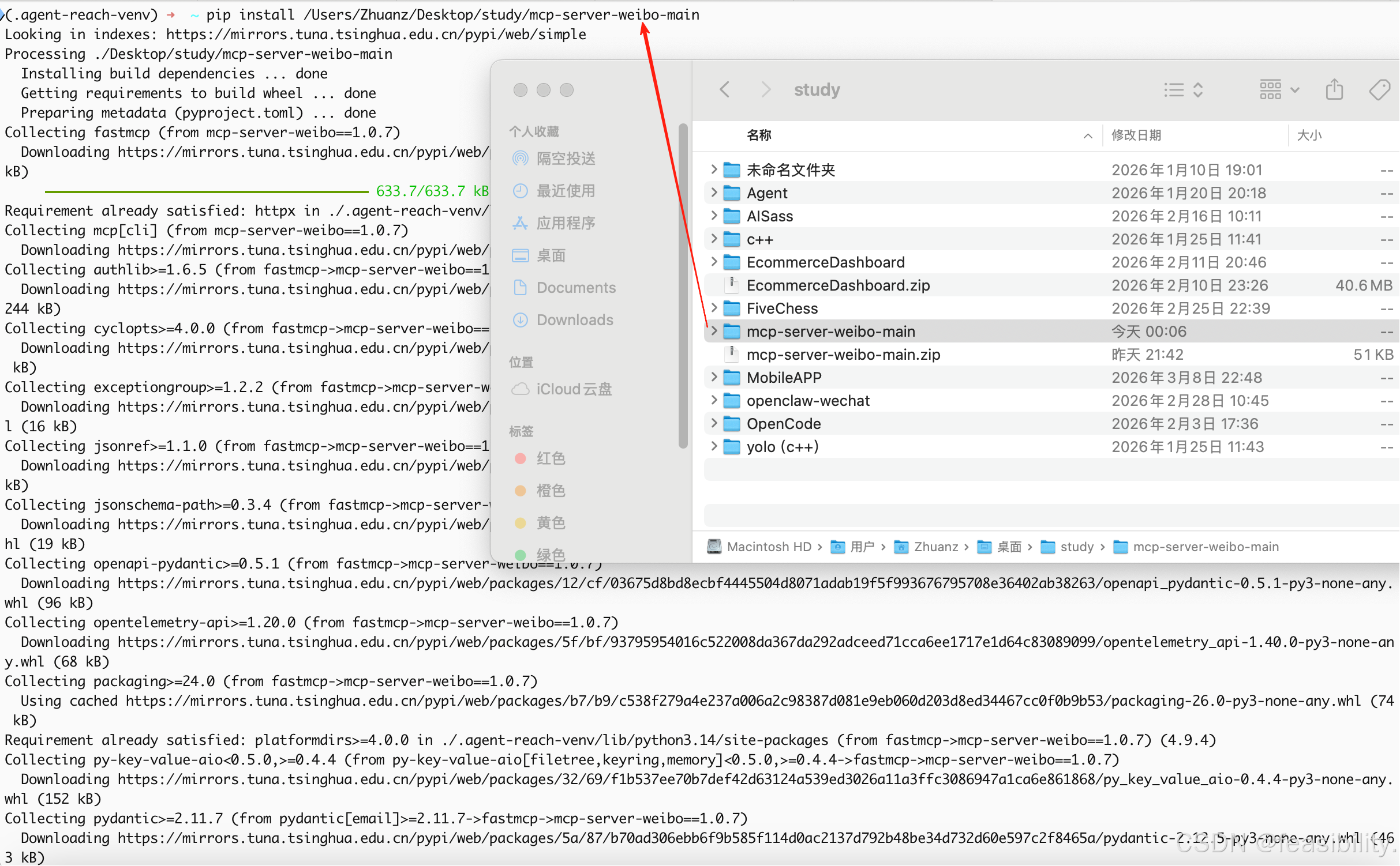 可执行重新执行前面下面或执行pip install git+https://github.com/Panniantong/mcp-server-weibo.git安装weibo的mcp,这里因为执行两个命令没成功走DL所以手动下载压缩包zip,解压到你认为合适的位置比如/Users/Zhuanz/Desktop/study