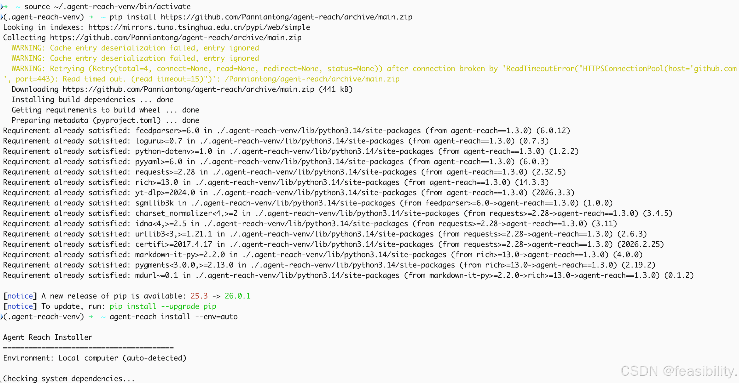 Agent Reach项目.agent-reach-venv通常在你的用户目录下,如果ai没创建或想手动安装就自己创建并python虚拟环境如python3 -m venv ~/.agent-reach-venv等方法(python3有效的前提是已经安装python),执行source ~/.agent-reach-venv/bin/activate激活,注意以实际路径为准,激活后执行pip install https://github.com/Panniantong/agent-reach/archive/main.zip安装agent-reach及其依赖项