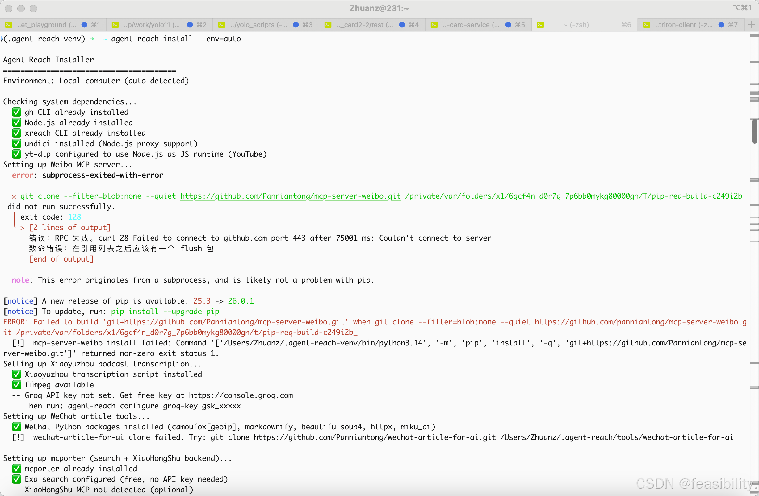 执行agent-reach install --env=auto自动安装ai未安装的工具(所以前面的npm和brew安装工具其实可以在这一步自动完成~),这里error是网络问题