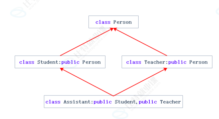 菱形继承存在数据冗余和二义性的问题 ,就像在上述图中,Assistant类继承了Student 和 Teacher ,这时assistant 中存在两个Person对象,产生了数据冗余和二义性(不知道哪个Person对象是真正需要的)