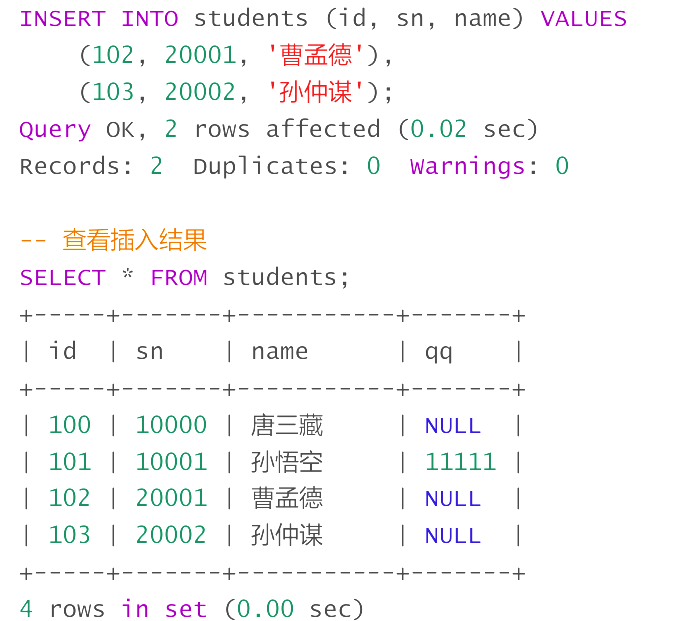 第一个参数是连接对象,第二个参数是要执行的 SQL,比如: