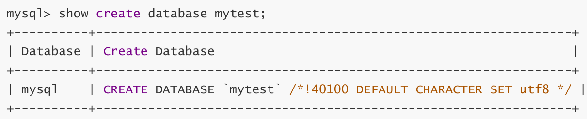 mytest:反引号 `是MySQL中用于包裹数据库名、表名、字段名的标识符,防止它们与SQL关键字冲突。这里表示数据库名叫mytest。 -
