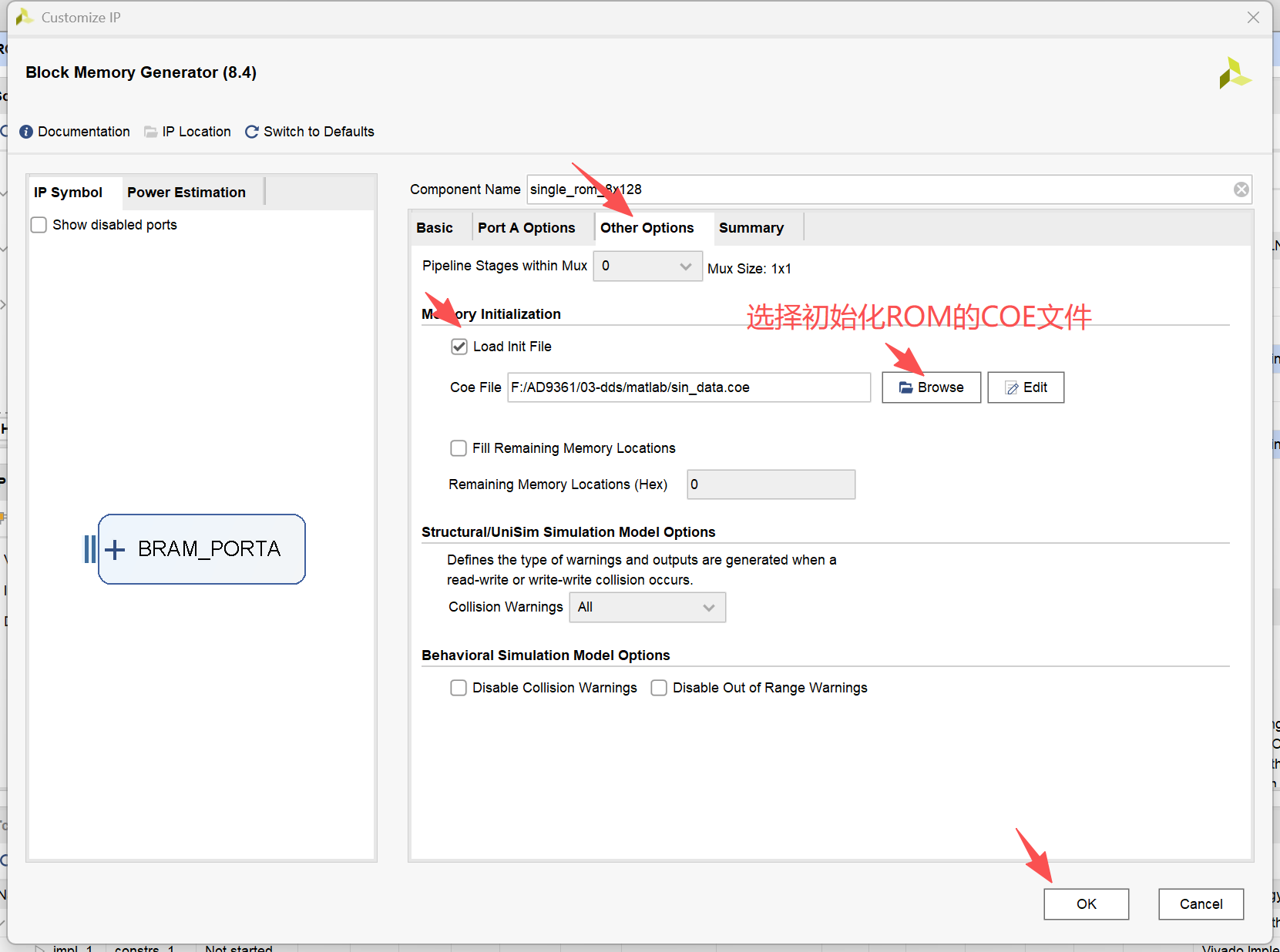 - 按照上面的步骤配置ROM IP核,并用COE文件进行初始化,这里选用cos_data.coe初始化ROM IP