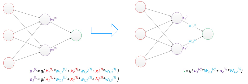 公式是线性代数方程组,因此可以用矩阵乘法来表达这两个公式,输出的结果与训练集标签进行损失函数计算,与逻辑回归基本一致。