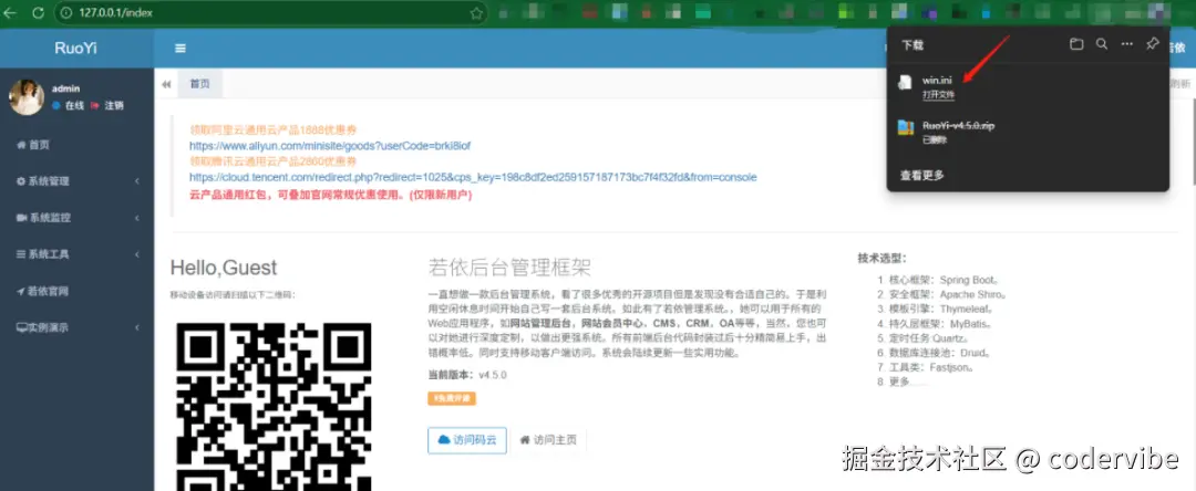 若依管理系统后台存在任意文件下载漏洞。影响版本:若依管理系统 4.7.6 及以下版本