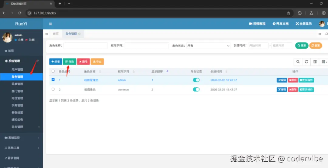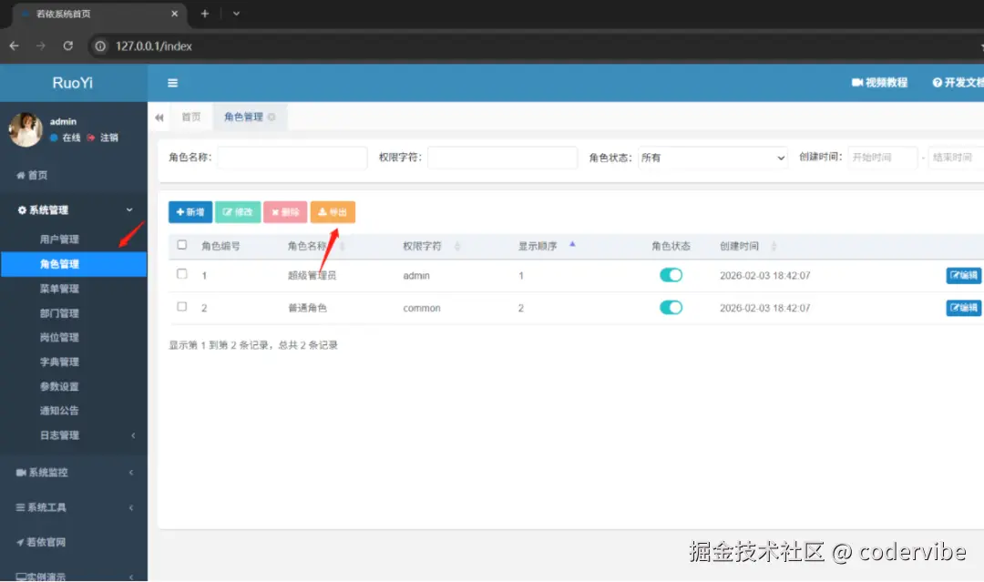 点击系统工具 --> 代码生成 --> 导入 --> 用户和角色关联表