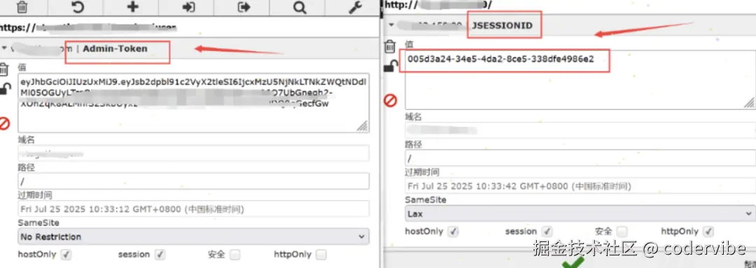 新版本的若依系统的cookie值是Admin-Token值且是JWT编码的,右边的是老版本的,就是jsessionid值。