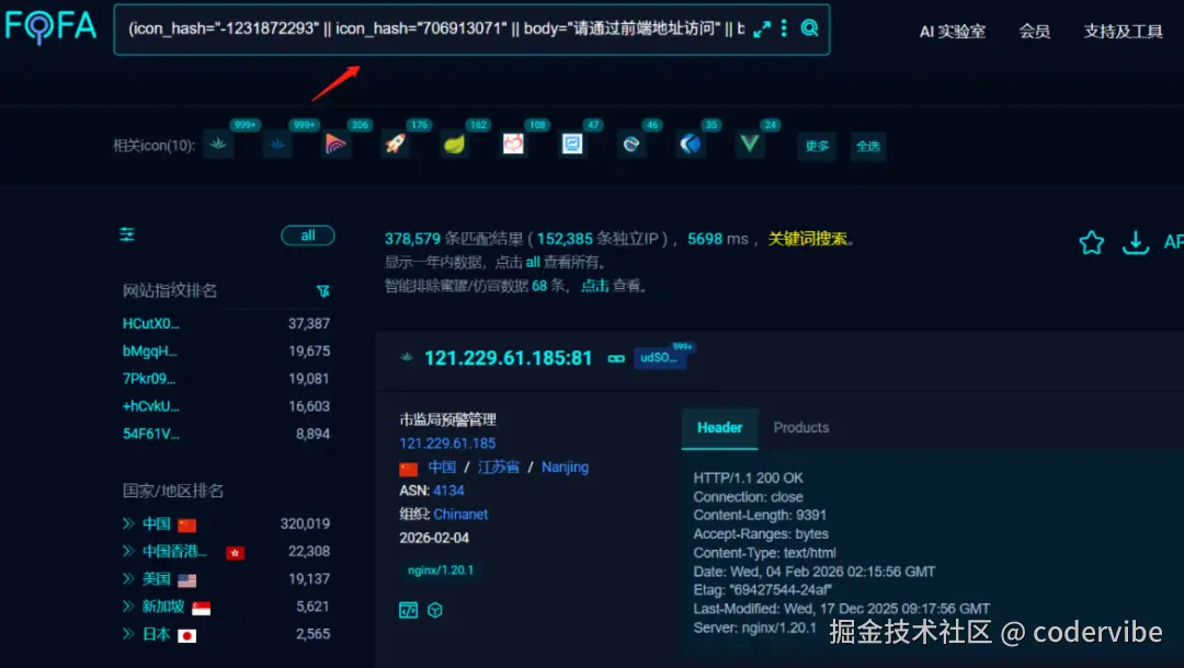 javascriptpath="/druid/index.html" (FOFA语法,找暴露的Druid) path="/swagger-ui.html" (找暴露的Swagger) path="/tool/gen/createTable" (找代码生成器的特定接口)- 地域或行业限定: