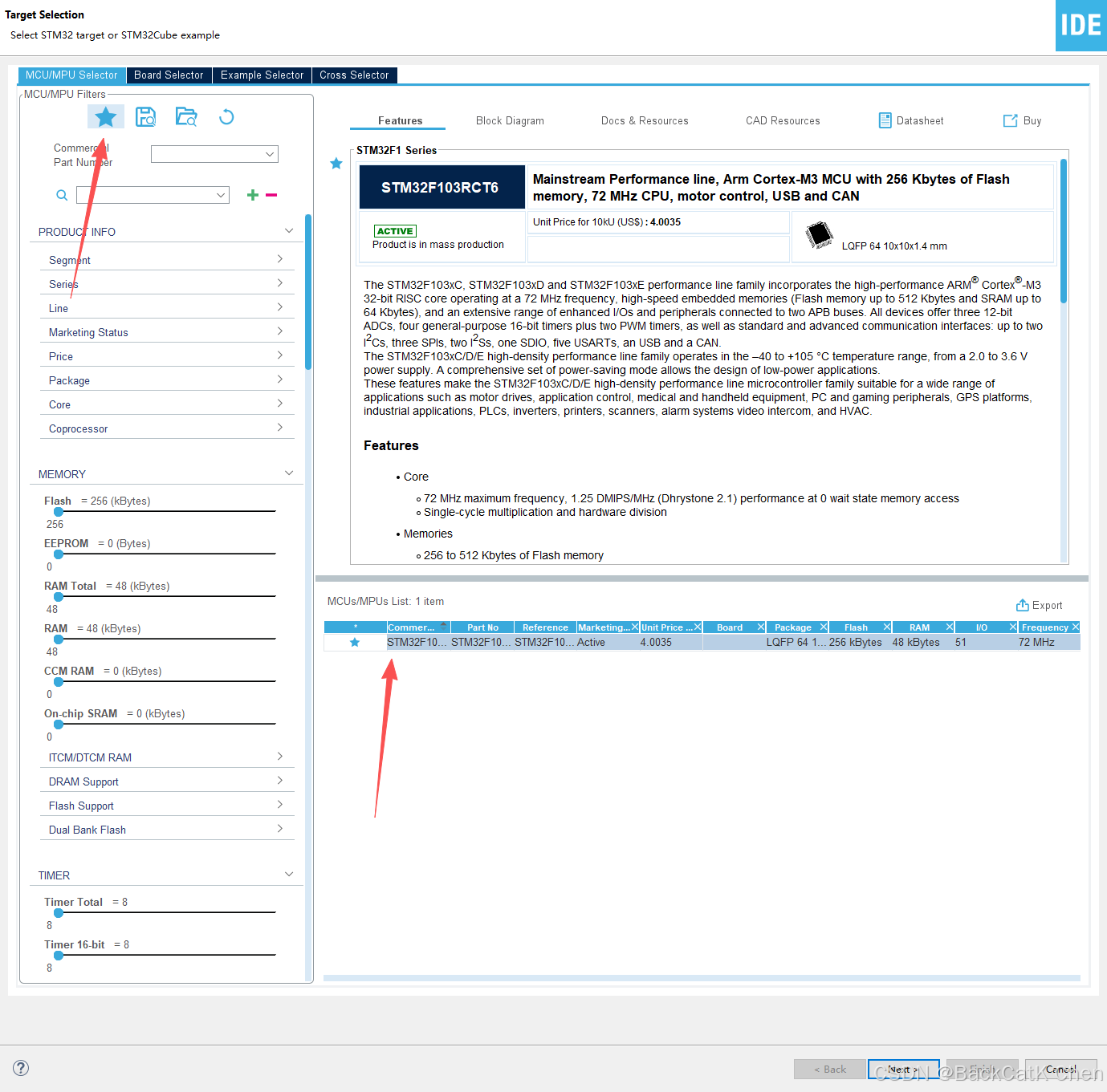 Commercial Part Number搜索框输入STM32F103RCT6,选中对应芯片后点击Next(可点亮右侧星星收藏,后续无需重复搜索);
