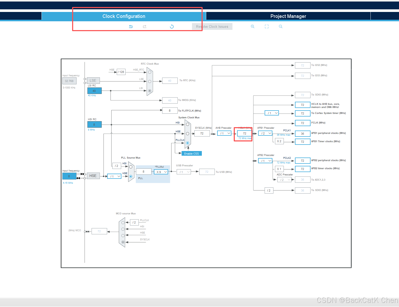 Clock Configuration,在HCLK (MHz)输入框填写72,按下回车,软件自动配置整个时钟树,无红色报错即配置成功;