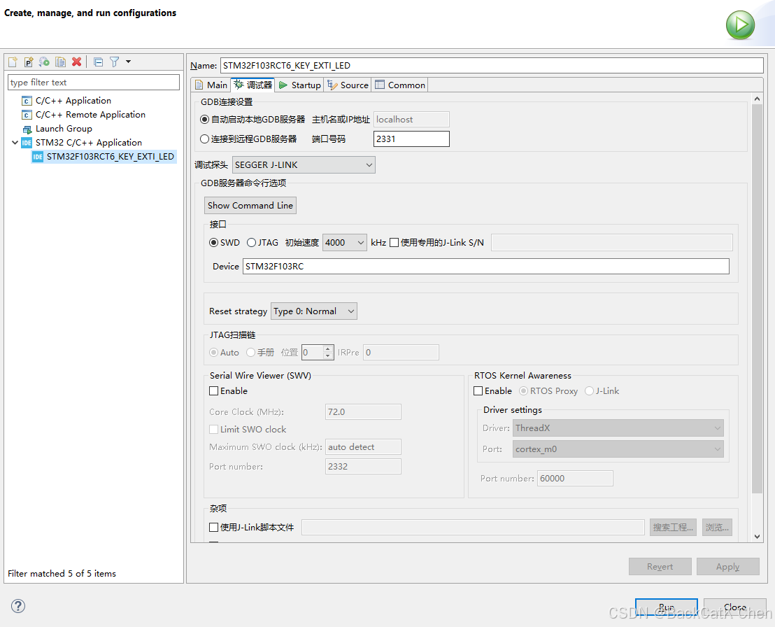 Debugger选项卡,修改以下核心配置:Debug probe选择SEGGER J-Link;Interface仍选择SWD;Device name填写STM32F103RC(必须精准,否则无法识别芯片);