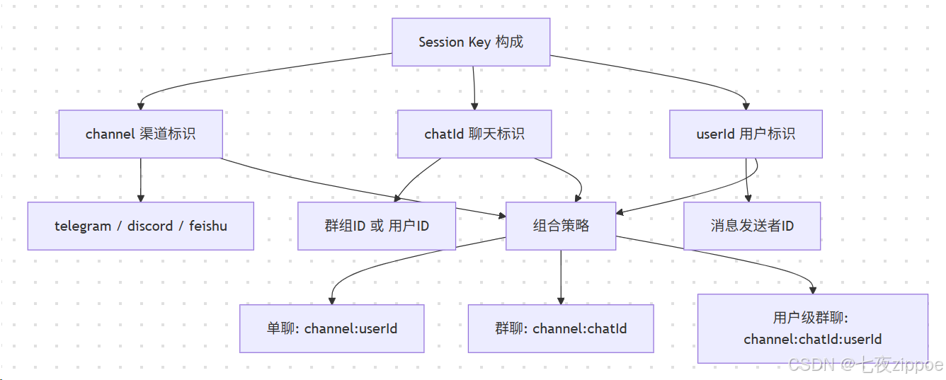 Session Key 是用于唯一标识一个 Session 的字符串。OpenClaw 采用分层组合的方式构建 Session Key,确保不同渠道、不同聊天、不同用户之间的会话能够正确隔离。