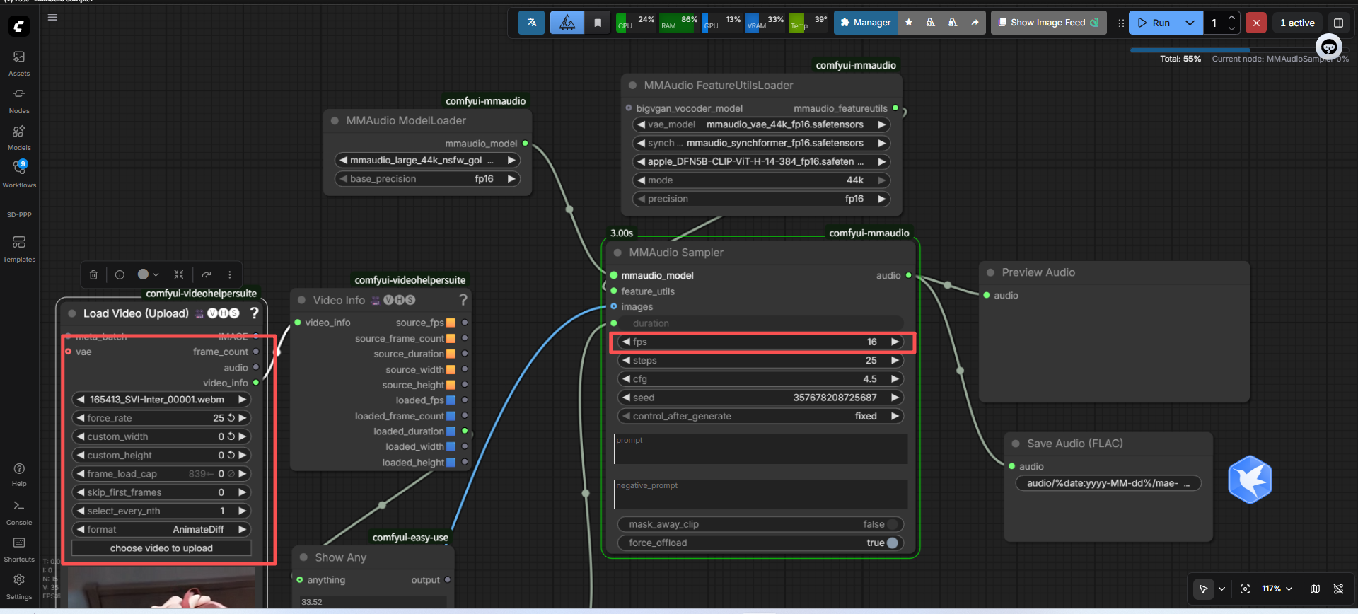 0:禁用强制帧率,完全沿用原视频的原生帧率加载;- 数值 > 0(比如你图中的 16):会对原视频做帧重采样,通过插帧 / 丢帧,把视频转换成目标 FPS,最终输出的