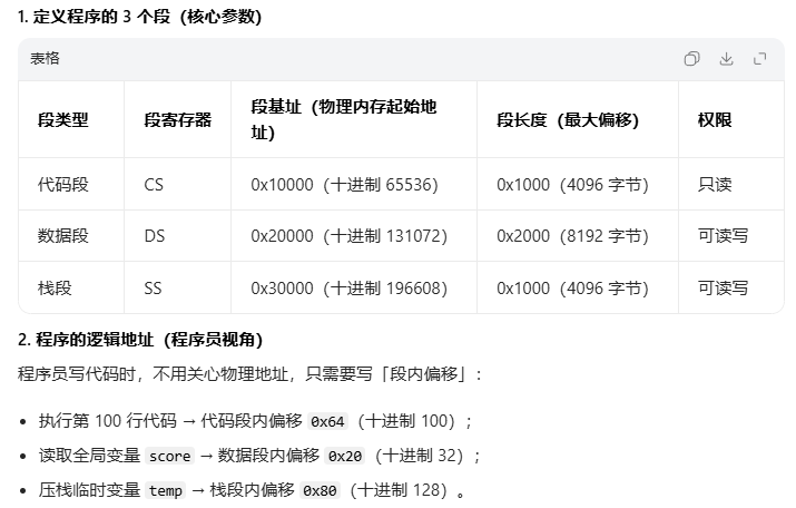 程序被分成不同的段,访问地址时用段地址+段内偏移量来表示。类似下面这样: