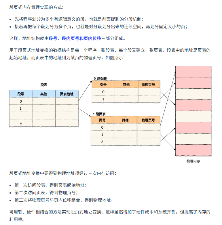 上面那个表就是段表。分段管理内存会引入外部内存碎片,不会引入内部碎片。分页管理会引入内部碎片,但是不会引入外部碎片。外部碎片存在于段和段之间,比如有3个段,两个碎片的内存之和有 3MB,但是是按照 1MB 和 2MB 分布的,这个时候就无法装入 2.5 MB 的程序。分页管理因为页的大小是固定的,内存碎片只存在于页内部。