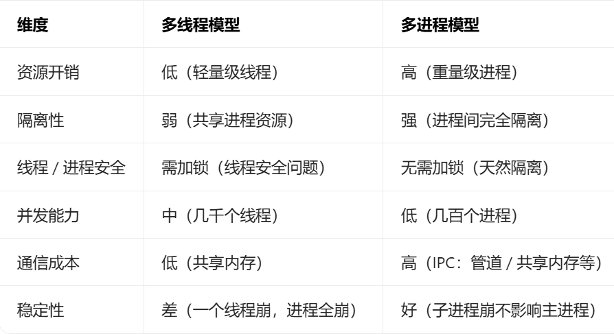 多进程模型是最基础的并发方案之一:主进程监听端口,每来一个客户端连接,就 fork 一个子进程专门处理这个客户端的所有请求。