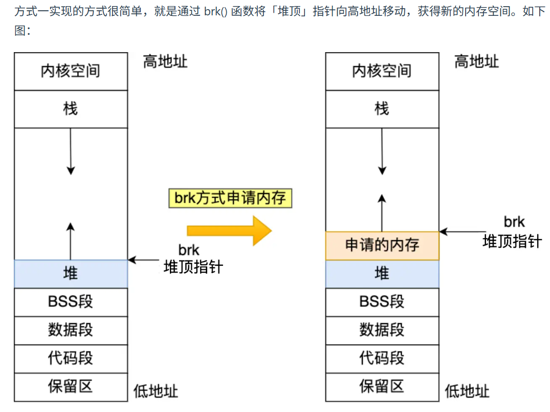 malloc 分配的是虚拟内存,在虚拟内存地址被真正访问之前,它是不会建立到物理内存的联系的。malloc 是 C 语言中的函数,底层是调用了 brk 和 mmap 两个系统调用. brk 是在堆区分配内存,mmap则是在文件映射区分配.