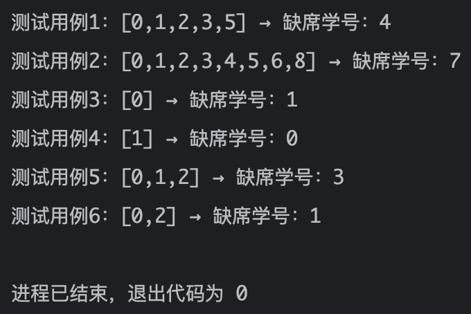 cout << "测试用例1:[0,1,2,3,5] → 缺席学号:" << sol.takeAttendance(rec1) << endl;