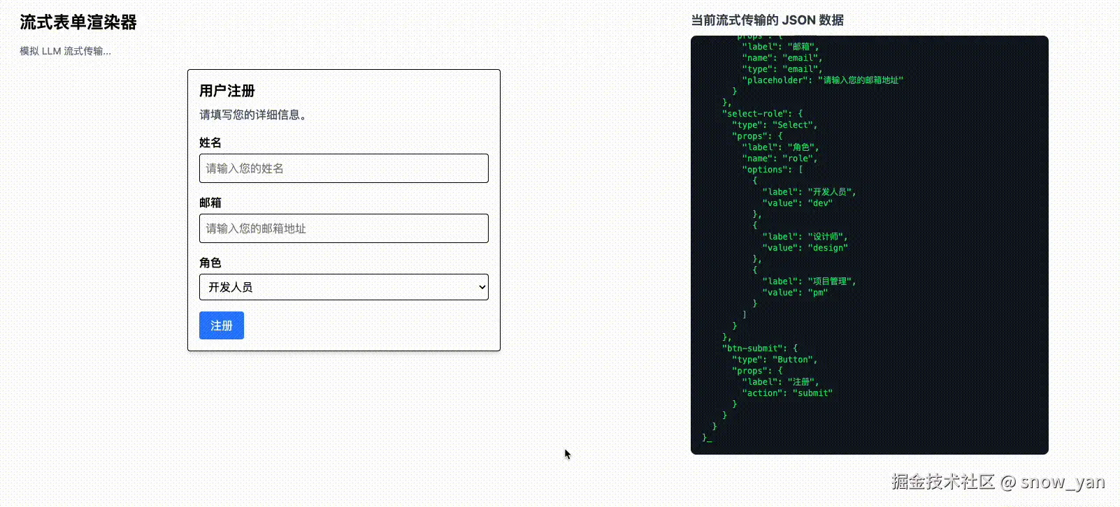本文将以本项目的流式表单场景为例,详细解析如何结合 @json-render/react 库,从底层字符串修复到顶层 React 渲染,优雅地实现流式表单的实时渲染方案。