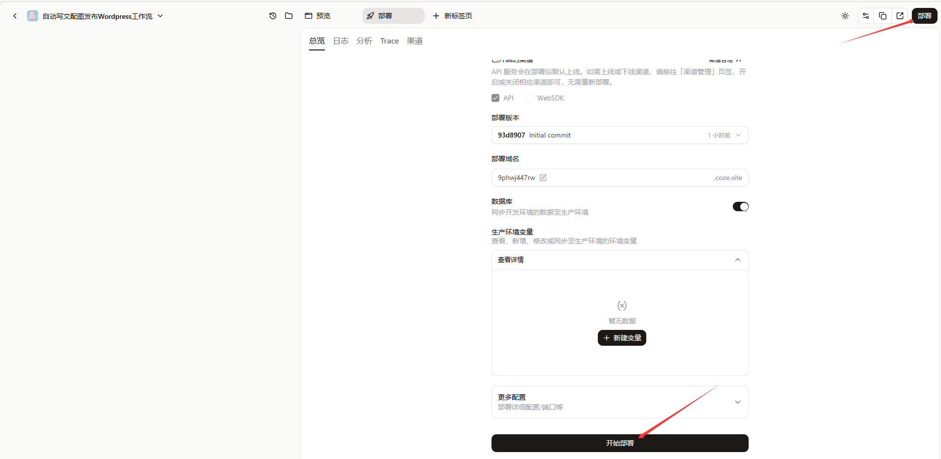 coze中实现了自动发布文章功能后,你需要点击部署工作流,部署完成后,可以生成API让Openclaw调用这个工作流。