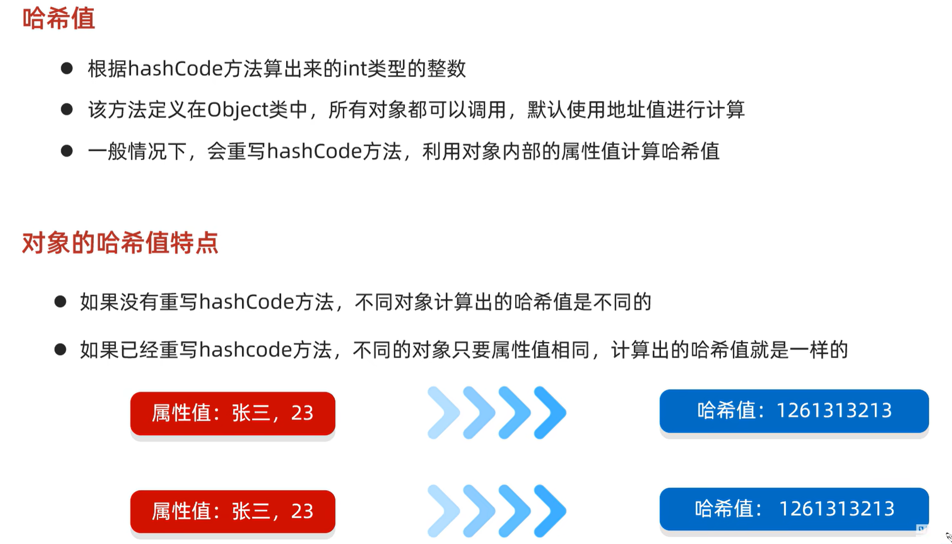 重写 hashCode(),不同对象但是相同属性 计算出的哈希值是相同的: